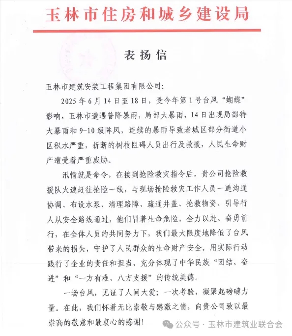 我会常务副会长单位玉林市建安集团公司在台风抢险救灾中积极表现受到上级主管部门通报表扬